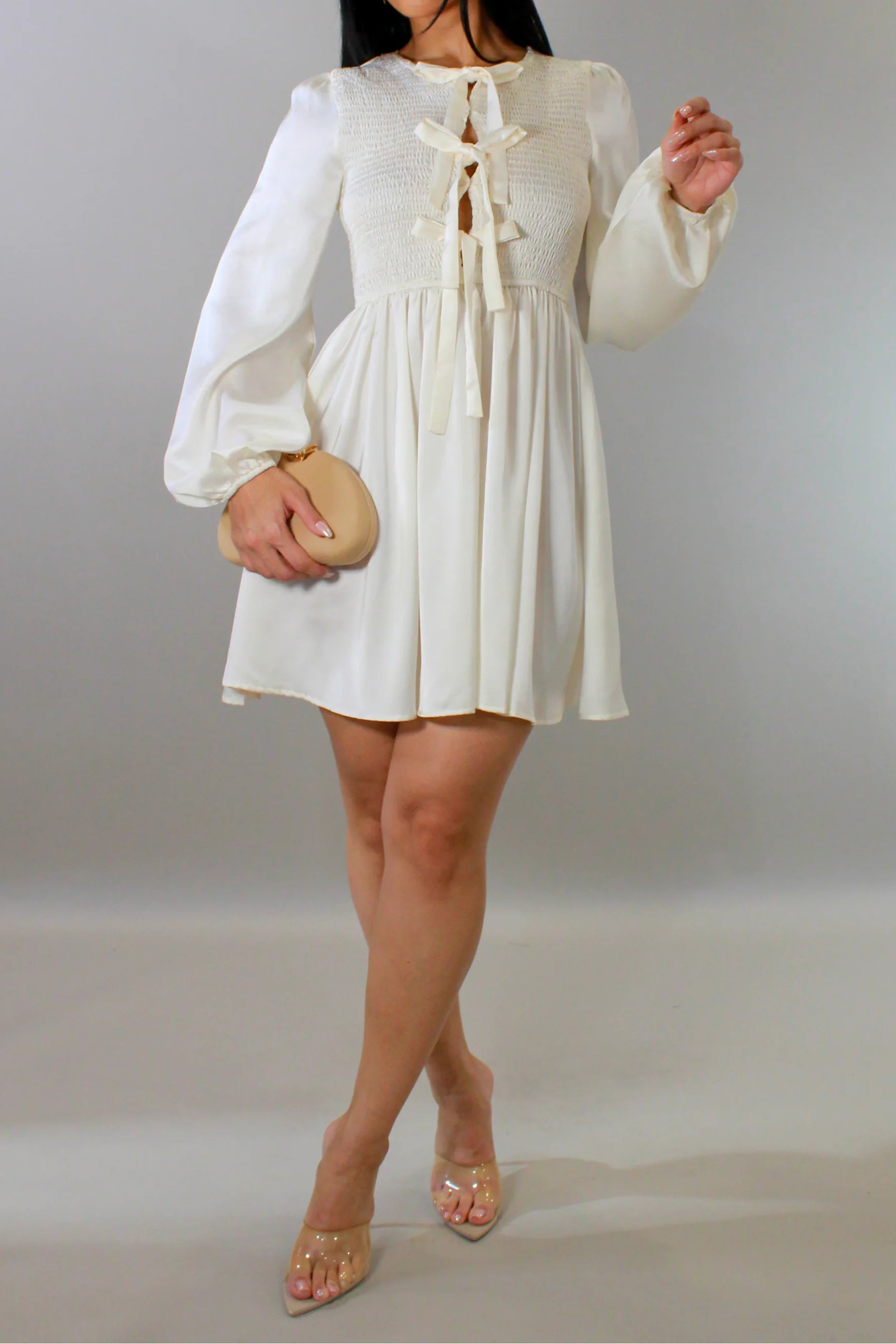 Elegance Lace-Tie Smocked Mini Dress – Cream