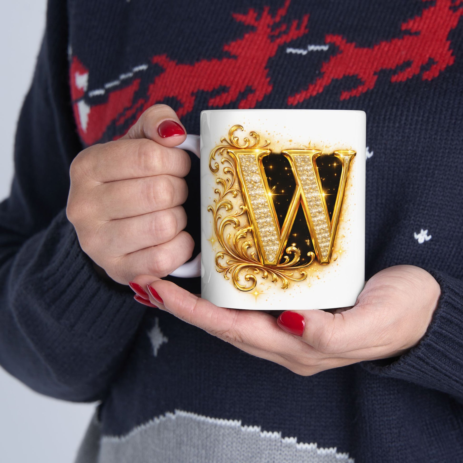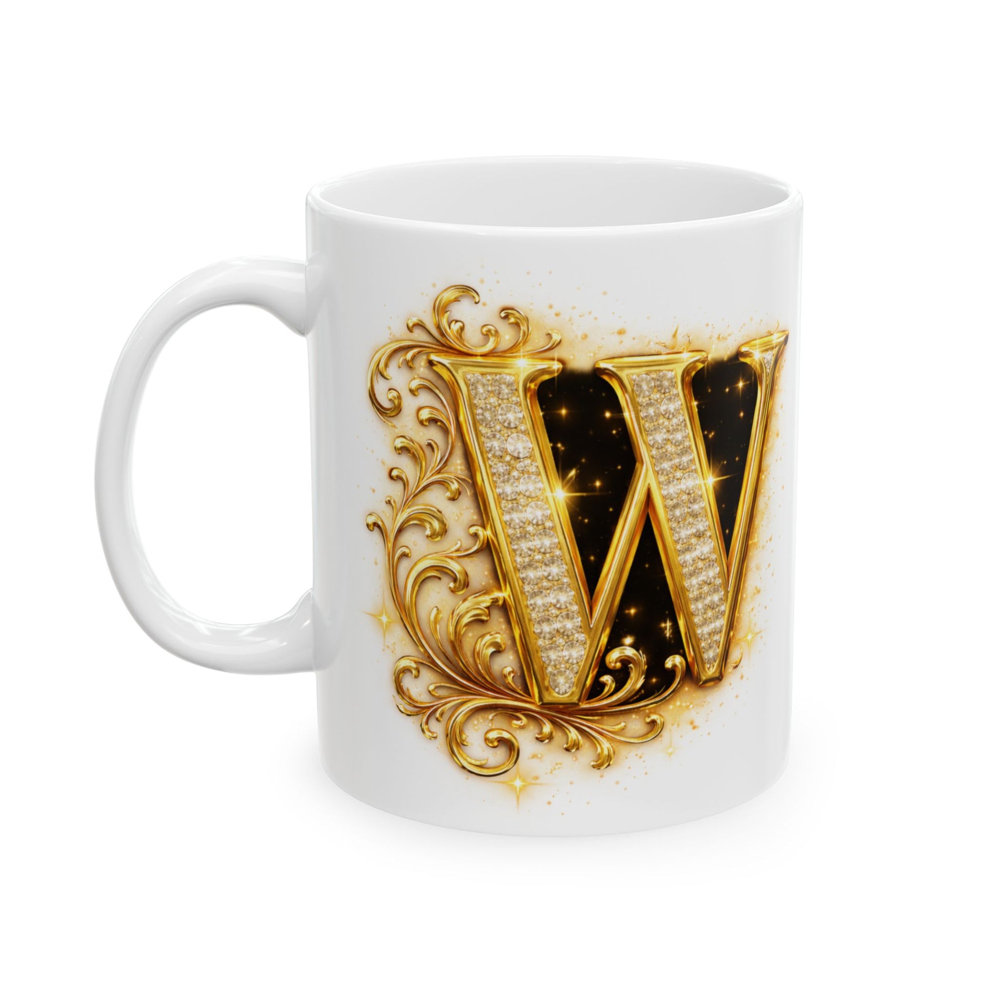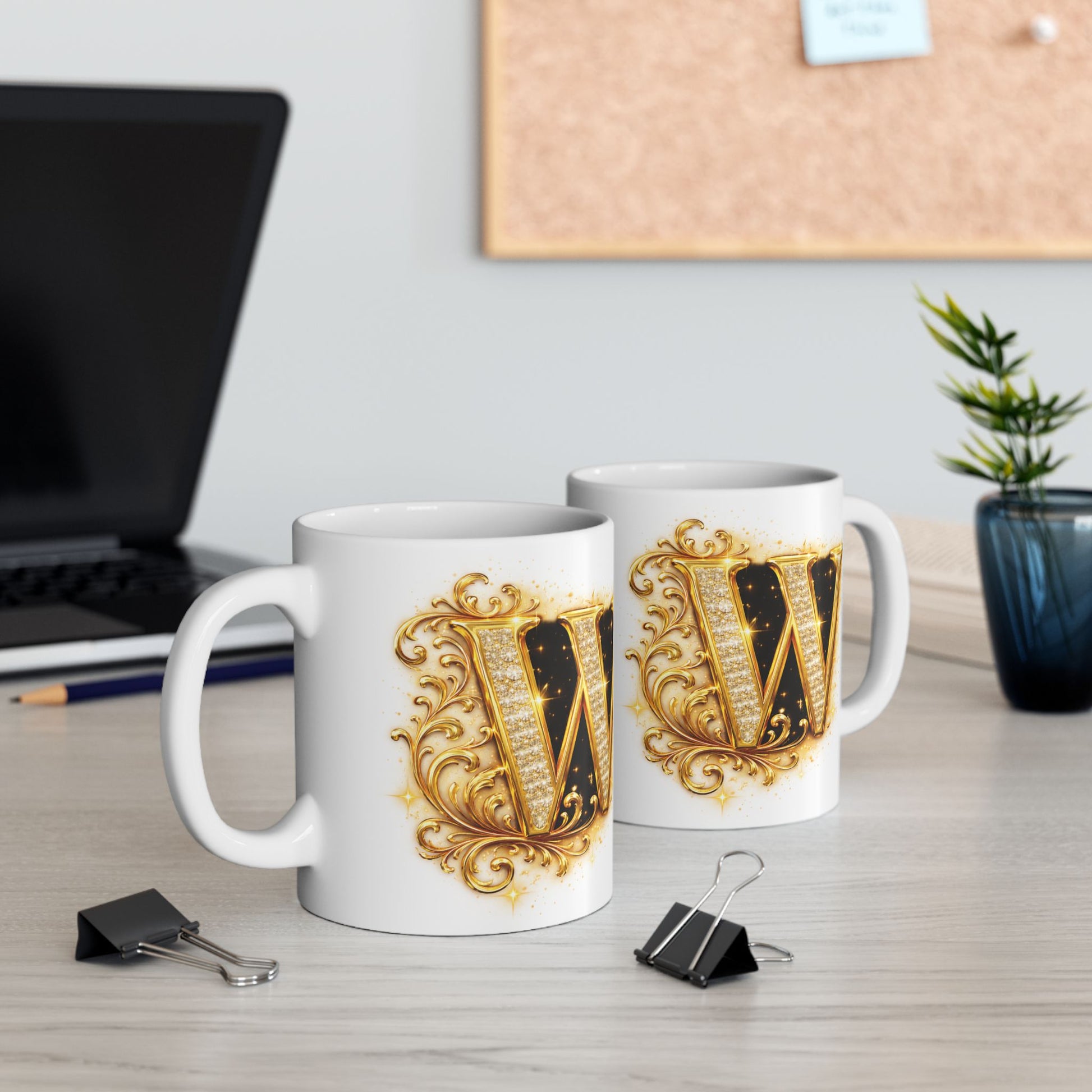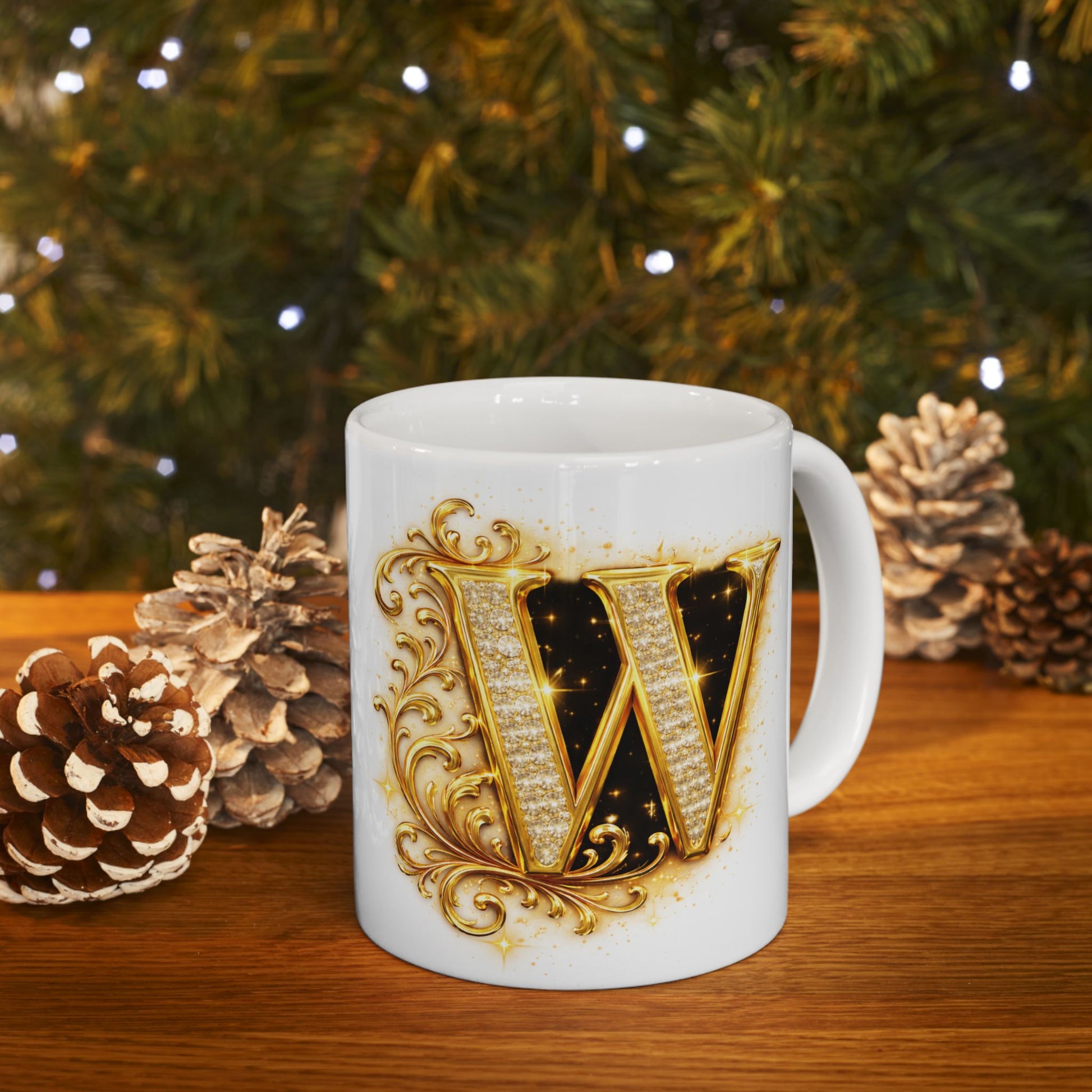Start your day with a touch of old-world glamour. This glossy ceramic mug features an ornate gold-letter W set against a deep, starry backdrop and framed by swirling baroque flourishes. It feels like holding a tiny heirloom — substantial in the hand, bright in the light, and made to add a moment of elegance to ordinary routines. Whether it lives on a cluttered desk during late-night projects or beside a cozy armchair for slow weekend mornings, the design brings a warm, slightly theatrical charm to daily sips. The rich gold tones and sparkling accents pair naturally with vintage décor, luxe stationery, or a curated coffee corner. Warm beverages settle in, and the mug’s confident shine keeps the moment special. Product features - Microwave-safe for quick reheats - Dishwasher-safe for easy care - Bright, vibrant print with glossy ceramic finish - Available in two sizes: 11 oz and 15 oz - Lead- and BPA-free with comfortable C-handle Care instructions - Clean in dishwasher or wash by hand with warm water and dish soap