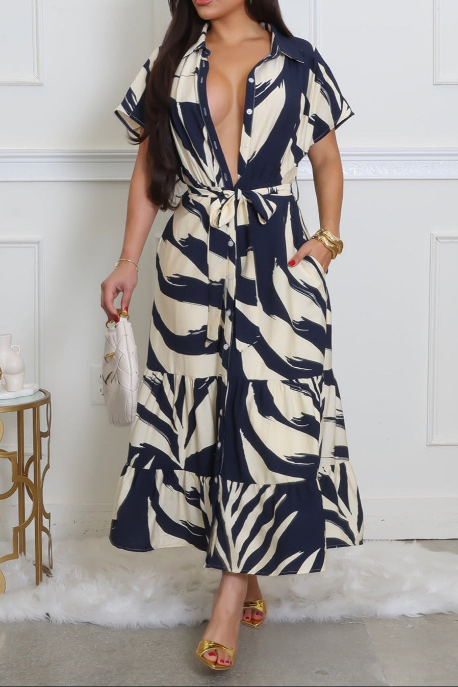 Make a bold statement in our Navy Zebra Print Belted Maxi Dress. Designed with a button-down front, short sleeves, and a matching waist tie, this dress brings effortless elegance with a touch of edge. The deep V neckline adds drama, while the flowing tiered skirt creates movement and comfort. Perfect for brunch, vacations, or evenings out.